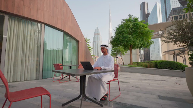 An Emirati man in a white kandura sits outdoors with a laptop, surrounded by skyscrapers and greenery, blending tradition and modern work life.