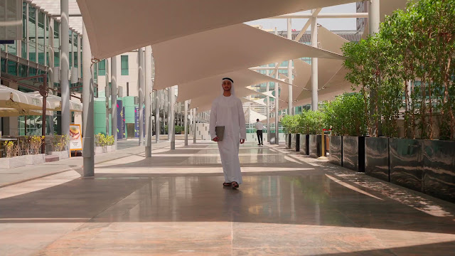 An Emirati man in a white kandura walks through a shaded city walkway, holding a laptop and surrounded by greenery and cafés.