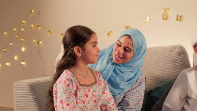 An evening filled with love and joy as an Emirati family watches TV together, sharing smiles and conversations. A special focus on the mother and the daughter interacting together.