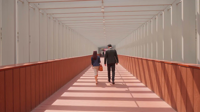 A man in a suit and a woman in smart casual walk together across a bright architectural bridge, blending style with modern city life.