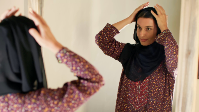 A young Emirati woman gets ready in the mirror before Iftar, fixing her hijab