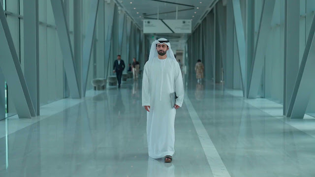 An Emirati man dressed in traditional kandura walks confidently through a sleek, glass-walled office corridor.