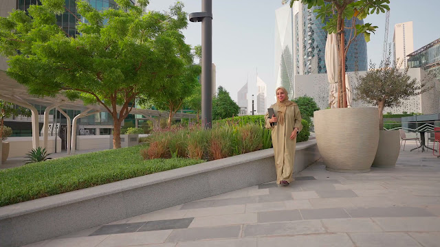 An Emirati woman in a beige abaya walks confidently through a lush, modern garden in DIFC, holding a folder and smiling.