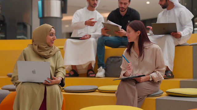 A diverse group of professionals, including Emirati men and women, collaborate in a contemporary workspace. The team is engaged in discussion and note-taking, reflecting teamwork, innovation, and leadership in a UAE corporate environment.