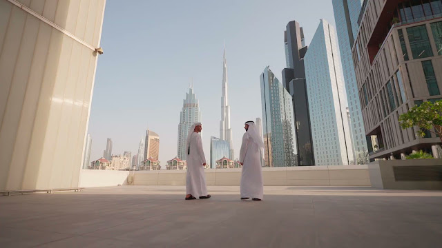 Emirati Men in Kandura at DIFC with Burj Khalifa View