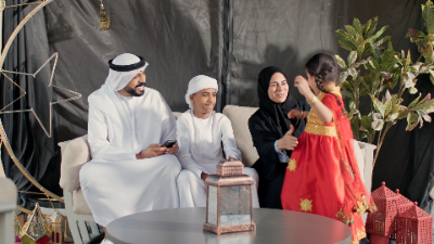 A heartwarming Emirati family moment as a young girl embraces her mother while her father and brother share a joyful laugh. The scene reflects love, togetherness, and the spirit of Ramadan.