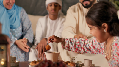 An Emirati family consisting of father, mother, young son and daughter gather after Iftar for precious family time. The young daughter is shown enjoying traditional Emirati sweets called louqaimat while dipping them in sauce while her parents watch