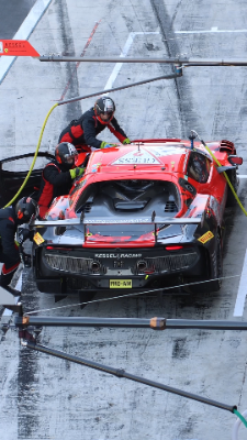 Shot of a red car at the pitstop during the Lenovo Gulf 12 Hours race in Yas Marina Circuit