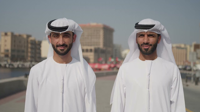 Two Emirati men in traditional kanduras and ghutras stand by Dubai Creek, with the city’s heritage buildings and waterfront in the background.