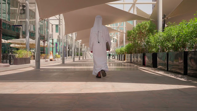 An Emirati man in a white kandura walks away through a shaded urban path lined with greenery and cafés, laptop in hand.