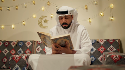 An Emirati father is seen in prayer and Quran recitation, a moment during Ramadan.