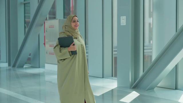 An Emirati businesswoman walks through a sleek, sunlit office corridor holding a laptop and smiling confidently. The bright setting and contemporary design reflect ambition, professionalism, and the UAE’s dynamic business environment.