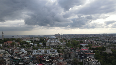 Cloudy Day Flight Over Istanbul's Mosque and Sea"