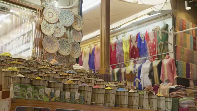 A traditional Dubai souk scene with baskets of spices, handcrafted plates, and vibrant fabrics and dresses on display.