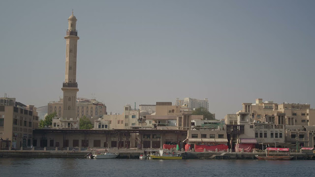 A tall mosque minaret stands over traditional buildings and boats along the Dubai Creek waterfront, blending Islamic architecture with the charm of Old Dubai.