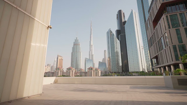 A wide view of Dubai International Financial Centre (DIFC) with the Burj Khalifa rising among modern skyscrapers. A scenic shot capturing Dubai’s urban architecture and business district.
