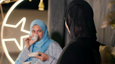 A warm moment showcasing two Emirati women engaging in a joyful conversation over coffee, illuminated by soft Ramadan decorations. This authentic scene beautifully captures friendship, connection, and the spirit of Ramadan gatherings in the UAE.