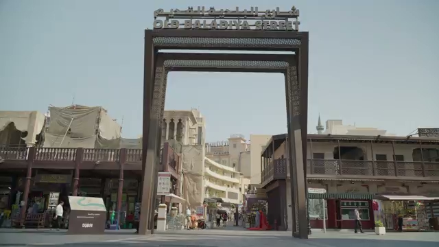 The iconic gateway to Old Baladiya Street in Dubai, surrounded by traditional architecture, shops, and the charm of the city’s historic trading district.