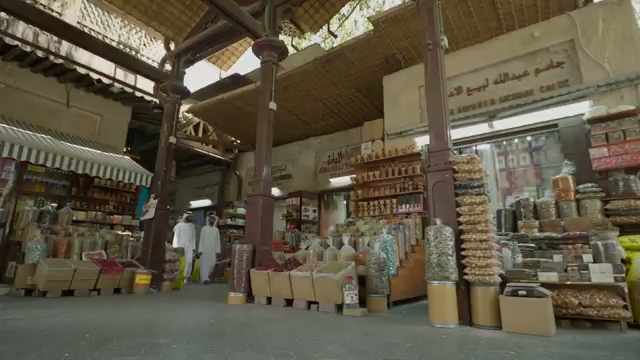 Two Emirati men dressed in traditional kanduras walk past a spice shop in Dubai Souk, surrounded by sacks of herbs, dried goods, and cultural market displays under the wooden roof.