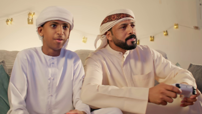 The living room turns into a gaming arena as an Emirati father and son share laughs, teamwork, and a little friendly competition.