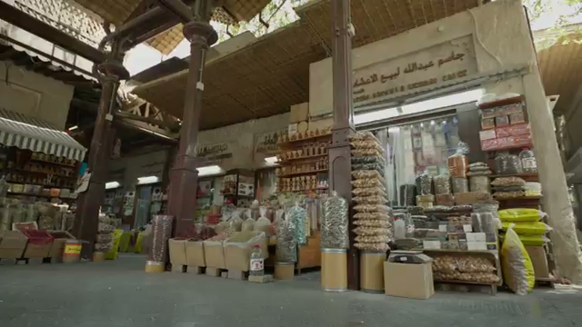 Emirati men in white kanduras walk past a spice shop in Dubai Souk, with sacks of spices, herbs, and dried goods displayed under the wooden roof of the traditional marketplace.