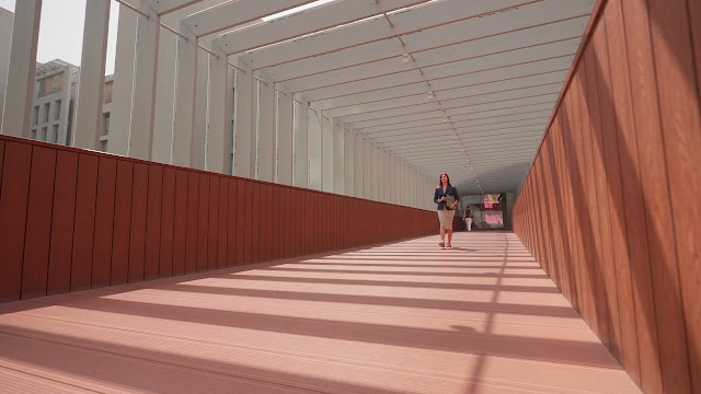 A professional woman in a navy blazer and grey dress walks confidently through a modern, sunlit corridor with geometric shadows cast on the floor.