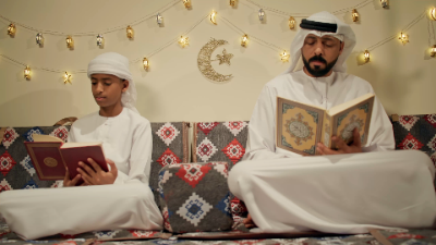 An Emirati father and son engage in a moment of spirituality while reading the Holy Quran at home. The house is decorated in Ramadan decor