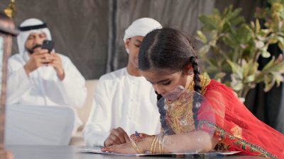 A father preserves a beautiful moment as his daughter immerses herself in drawing, showcasing the simple, heartfelt moments that define family during Ramadan.