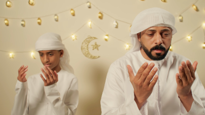 In a serene setting, an Emirati father and his son connect through prayer, embodying love, faith, and tradition.