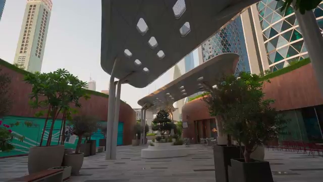 A landscaped pedestrian walkway in Dubai International Financial Centre (DIFC), featuring futuristic canopy design, modern buildings, and lush greenery. A blend of contemporary architecture and urban lifestyle in Dubai’s business hub.