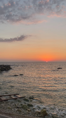 Short video of colorful sunset on a rocky beach with people paddle-boarding and sailing
